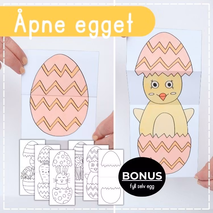 Filen inneholder 5 ulike egg, Kanin, blomst, kylling, godteri og gulrot. I tillegg er det en med blank hvor du selv kan bestemme fyll.