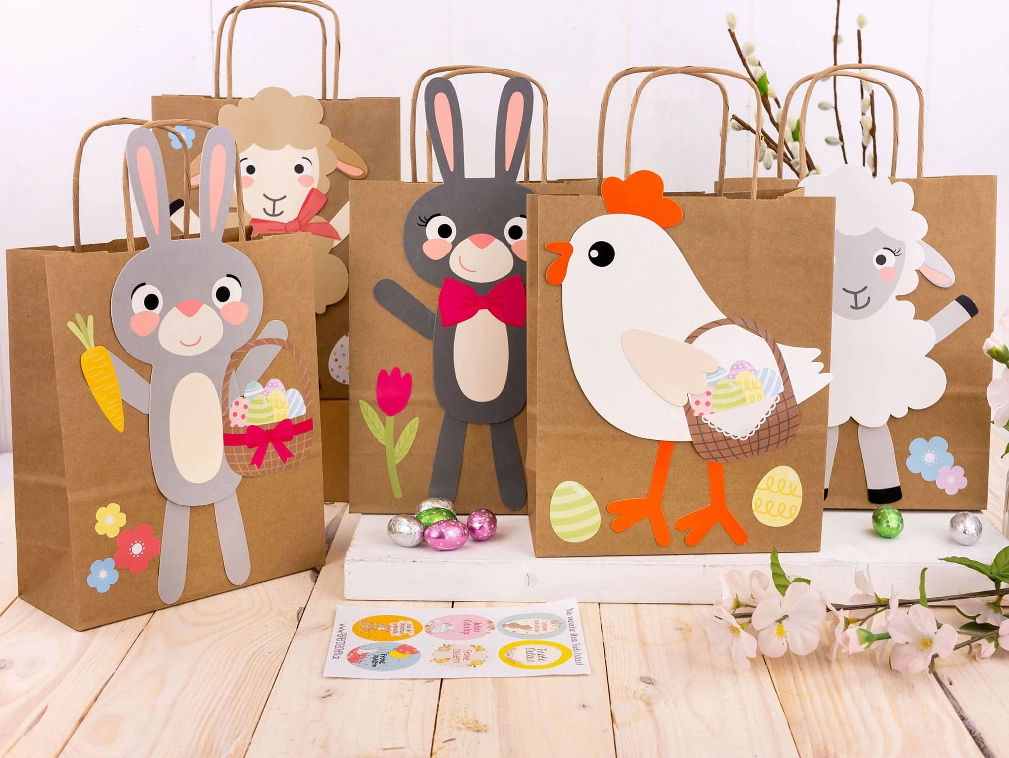 Samtidig som du får en gaveinnpakning som skiller seg ut. Hver pose blir en liten karakter: kanin, kylling, sau eller høne – klar til å fylles med overraskelser.